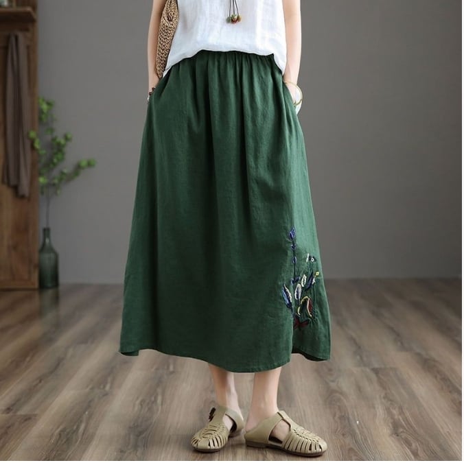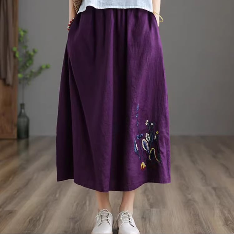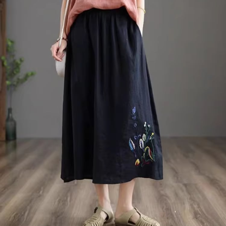 レトロ刺繍入り フレアスカート ミモレ丈 【A00005】